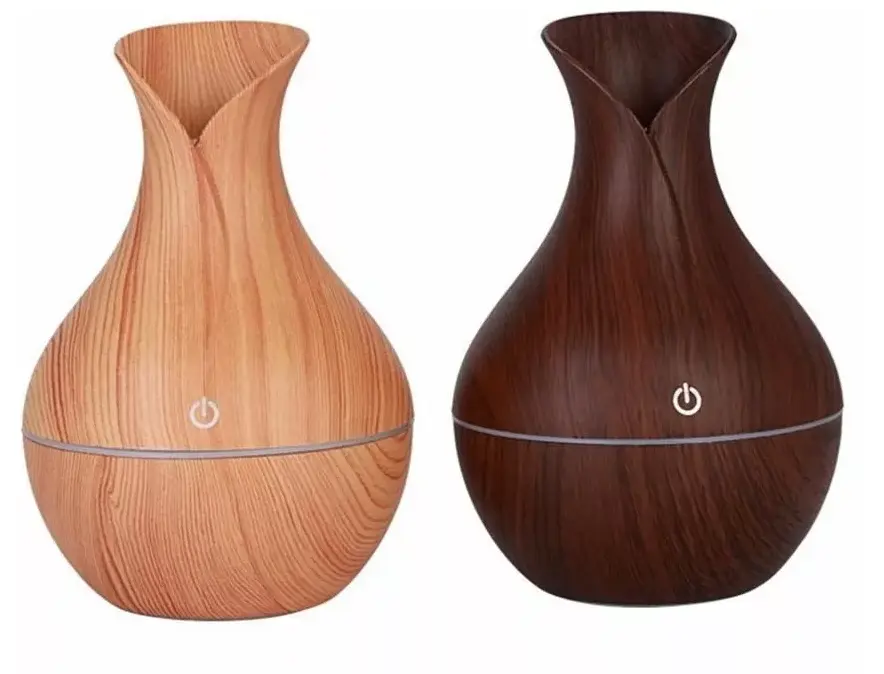Humidificador Estilo Jarro de Madera 130Ml Apto esencias al agua (no al aceite) Humidificador con base simil madera iluminación LED, Va cambiando de color, 7 colores Tiene función humidificadora y aromaterapeutica. Elimina la electricidad estática, reduce la radiación de los productos electrónicos y partículas de polvo en el aire. Ideal para: spa, práctica de yoga, relajación, hogar.