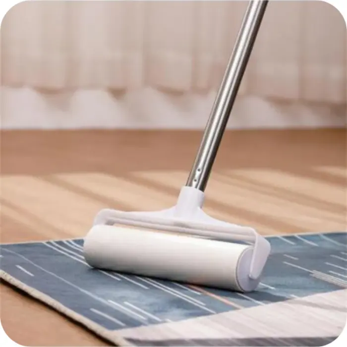 Rodillo adhesivo sacapelusas extensible Uso domestico cortinas, alfombras, sillones etc. Incluye 3 rollos + mango extensible Largo del mango: 1 metro Ancho del rollo: 24 cm Color blanco